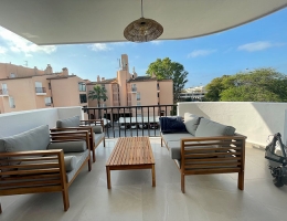 Elegant duplex with separate entrance to a gated complex. Located at the entrance of Marbella, 5 minutes walk to Cabopino beach. The apartment has been recently refurbished and is equipped to high standards. Fully complete kitchen and bathroom. Rooms decorated with detail. Large terrace overlooking the Mediterranean Sea.